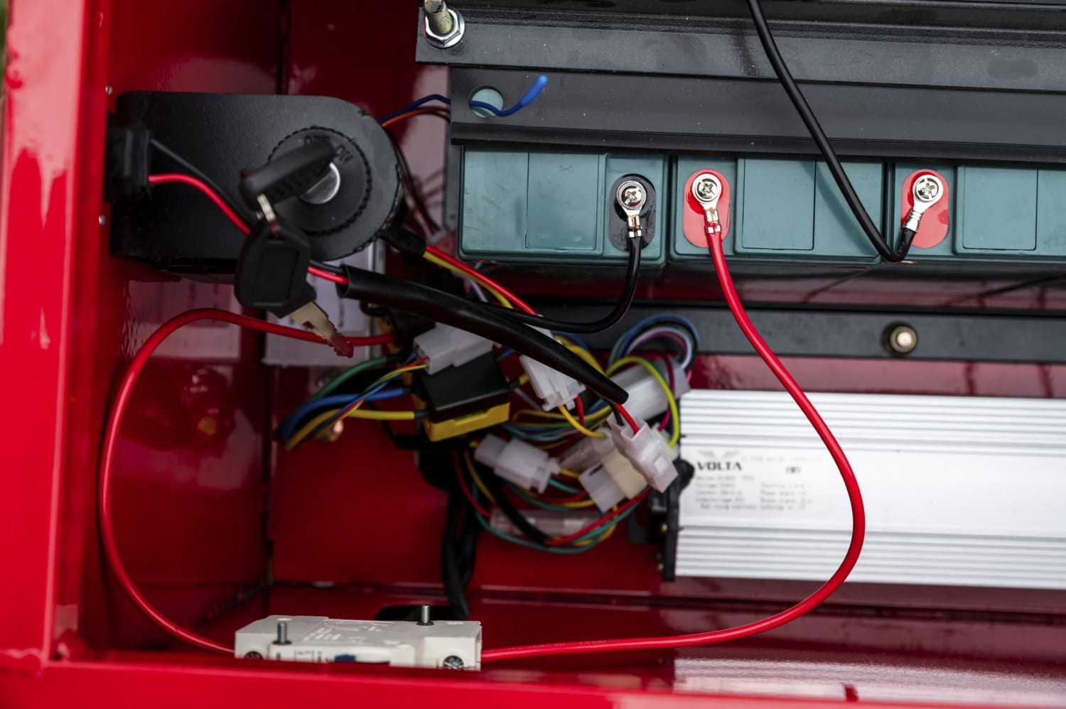 Wir haben das Ladestrom-Generator unter der Ladefläche verbaut. Dort befindet sich der benzingetriebene Generator und der Tank. Die Akkus befinden sich nun unter der Sitzfläche und sind mit einer Sicherungsstrebe befestigt. Sie können den Ladestrom-Generator während der Fahrt per Knopfdruck einschalten. So laden Sie die Akkus und haben sofort die volle Leistung zur Verfügung.